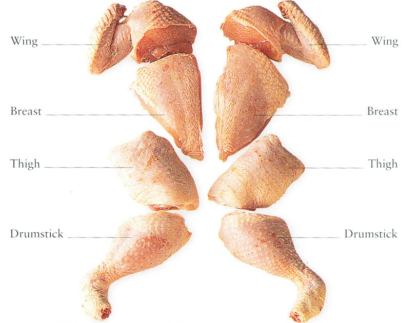 A medium-sized or large bird can be jointed into four, six or eight pieces. For some dishes you may wish to keep the breasts and/or the legs intact, but to ensure there is some white and dark meat for each serving, breasts are cut in half with the wings attached and the legs are split into thighs and drumsticks.