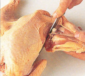 Place the bird breast-side up and cut one leg away from the bird. Cut through the thigh joint, to separate the leg from the body. Repeat.