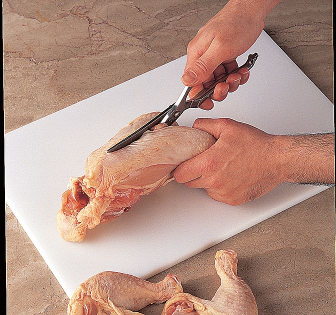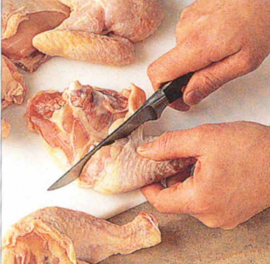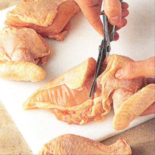 Cut each leg in half through the knee joint, following the line of white fat on the underside. Cut off wing tip at first joint.