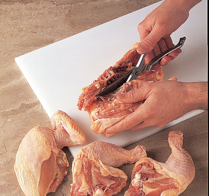 Cut each breast in half diagonally with the shears, so that one piece of breast has the wing attached.