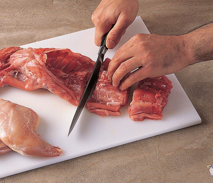 Rabbits can be roasted whole, but it is more usual to joint them for slow-cooking in casseroles and stews. It is only wild rabbit that you may need to joint, since domestic rabbit is mainly sold ready jointed. A whole rabbit, depending on size, can be jointed into six to nine pieces which will feed three to five people. Boneless rabbit meat is a good choice for pâtés and terrines.