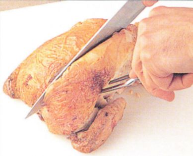 Before cutting up small and medium-sized birds, let them rest for about 15 minutes under a loose tent of foil so the meat can relax and the juices settle. This will make carving easier. After resting, remove any trussing string and cut up the bird using a large chef’s knife or carving knife. A two-pronged fork can be used to steady the bird.