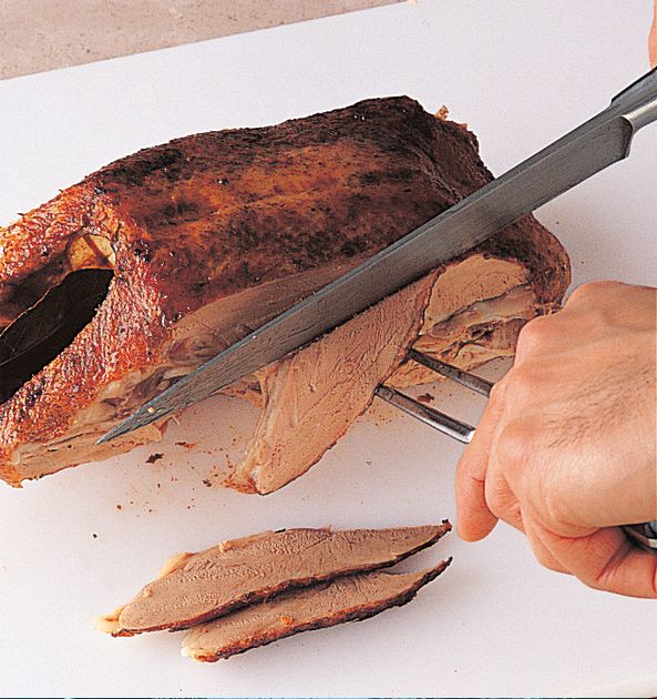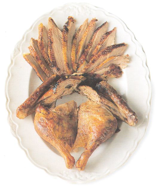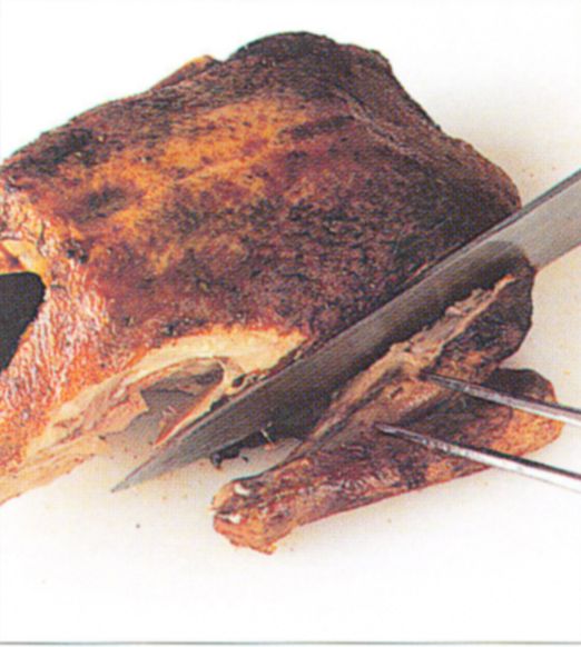 On the main body of the bird, cut away on side of the breast meat in slices, moving inwards towards the breastbone. Repeat on the other side of the breast. Arrange the sliced breast, legs and wings on a warmed serving platter.
