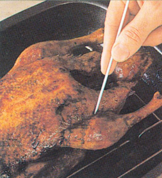 Roast the bird (see chart) first on one of its sides, then on the other. Turn it breast-side up for the remainder of the time until the juices from the thickest part of a leg run clear. Let the duck rest, loosely covered with foil, for 15 minutes.