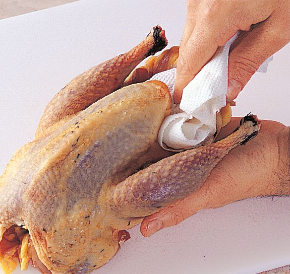 Roast the bird (see chart) until the juices from the thickest part of a leg run clear, and the tip of a knife feels warm to the touch when withdrawn. Leave to rest, covered loosely with foil, for 10-15 minutes before carving.