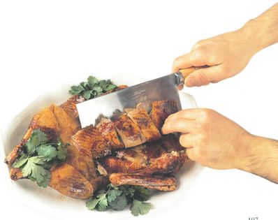 This is the classic Chinese method for carving roast duck. The pieces are reassembled on the serving plate in the shape of the bird. Garnish with sprigs of fresh coriander, if you like.