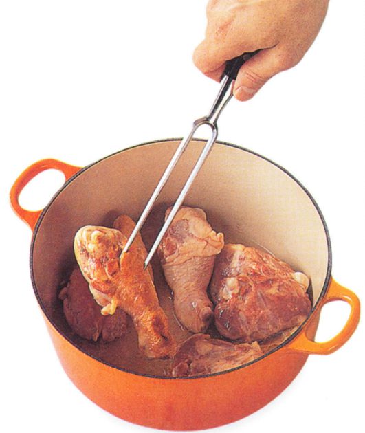 In a flameproof casserole or sauté pan, heat about 2 tbsp oil to a high heat. Add the poultry pieces and cook until they begin to brown, turning them frequently with a fork or tongs to ensure they colour evenly. Reduce the heat to moderate and cook for 25-30 minutes or until done - the juices should run clear.