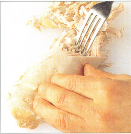 The firm breast meat is best suited to this technique. Remove the breasts from the carcass while still warm - they will come away more easily. Begin shredding at the tip of the breast and work along to the other end, using a fine-pronged large fork.