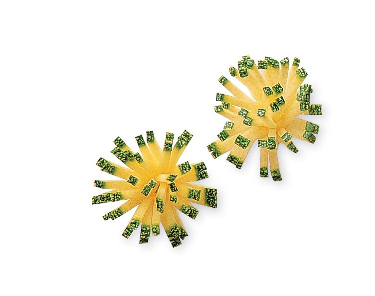 Make crosswise cuts in a thick ribbon of courgette, leaving one long edge intact. Roll up and stand, cut-edge up.