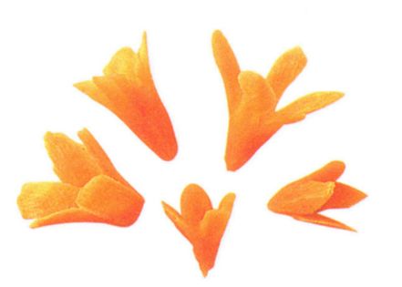 Make four angled cuts around the sharpened tip of a carrot to form petals. Twist off flower and repeat.