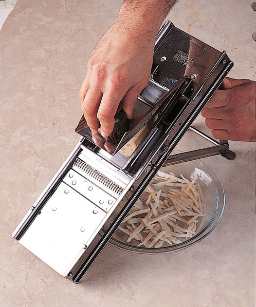 Celeriac, Jerusalem artichokes and kohlrabi are all knobbly vegetables that look difficult to deal with, but the technique of preparing them is remarkably simple. First peel off the skin with a small paring knife, then slice, chop, shred or grate the flesh, depending on future use (see box). Once the flesh is cut, immerse the pieces in acidulated water immediately to prevent discoloration (see box).