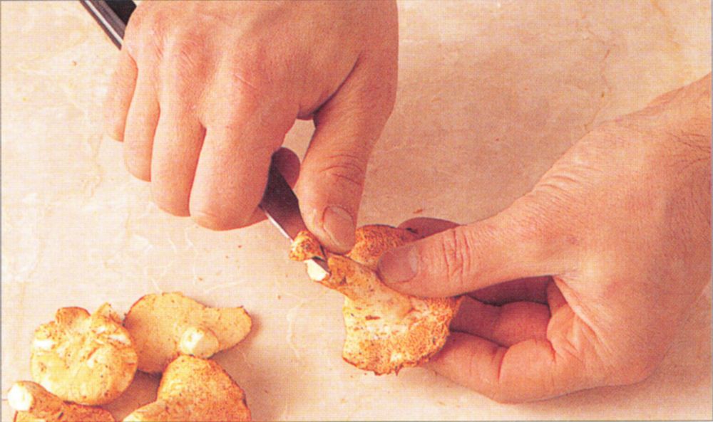 Trim off the woody ends of the stalks with a small knife. Leave as much of the flesh as possible. Many wild mushrooms are left whole or simply halved lengthwise, to preserve their attractive shape, but they can also be sliced in the same way as cultivated mushrooms.