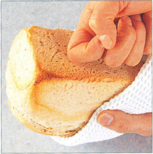 Take the loaf out of its tin, or off the baking sheet, and hold it in a folded tea towel. Tap the bottom with your knuckles. If the loaf is baked through, it will sound hollow. If it sounds dull, return it to the oven for 5 minutes, then test again. At this stage it is not necessary to put loaves back in their tins. Cool the bread on a rack.