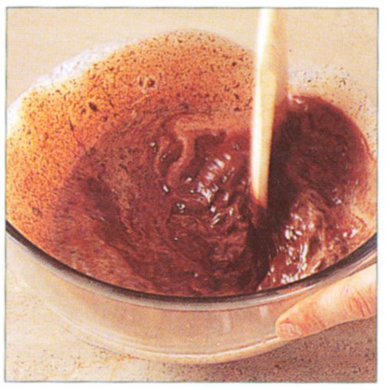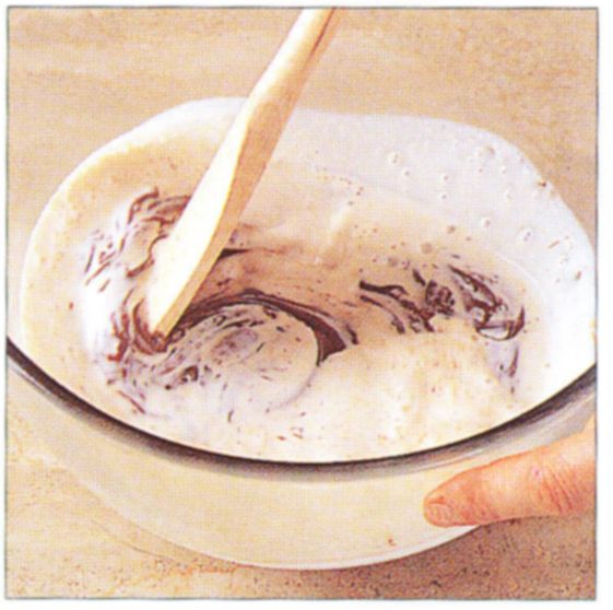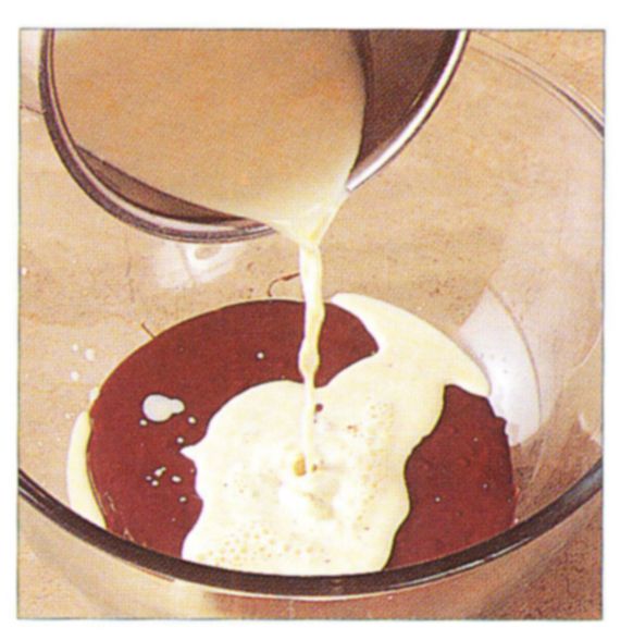1. Chop and melt 300 g chocolate. Heat 150 ml double cream; pour over.