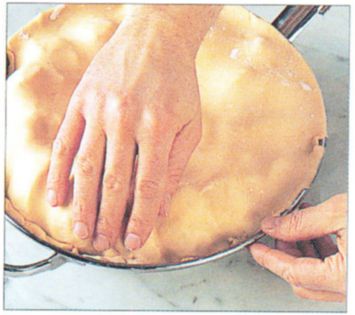 - Roll out shortcrust dough to a round slightly larger than pan. Place over fruit and trim off excess. Tuck in edges. Bake at 230°C, 20 minutes.