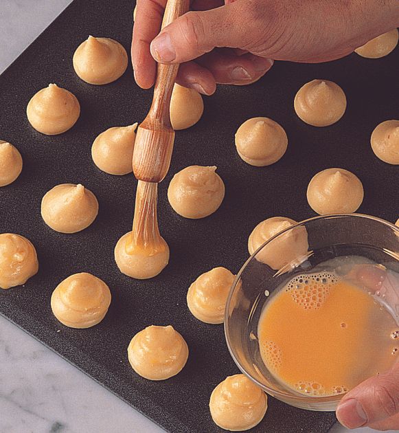 These small balls of choux paste are piped, baked, then cooled and either cut in half and sandwiched together again with a filling, or pierced in the bottom and piped with a filling. Before baking, lightly butter baking sheets and chill in the refrigerator - so the mixture will not slip when piped. Bake at 200°C, until golden, about 20 minutes.