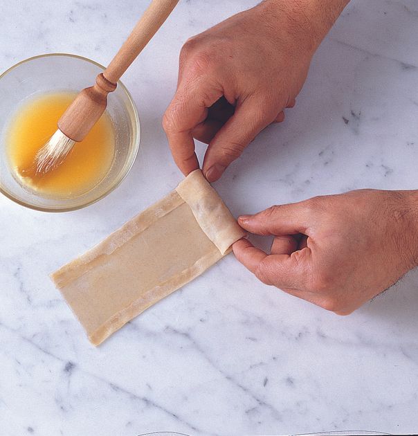 Paper-thin filo is perfect for wrapping around fillings, sweet or savoury. As with layering, keep filo covered with a damp cloth to prevent it drying out. Brush with melted butter after shaping and bake at 180°C, about 30 minutes.