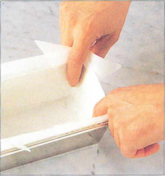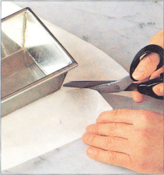 Place the greaseproof paper inside tin and overlap the corners. Press into the corners and sides of tin.