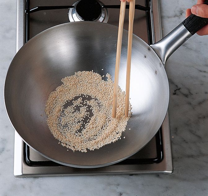 A popular garnish for Chinese dishes, sesame seeds become rich and nutty when dry-fried. An authentic wok and chopsticks are used here, but a frying pan and wooden spoon can be used instead.