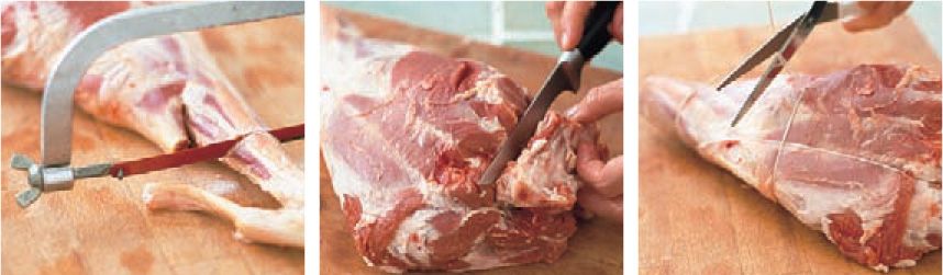 Next, turn the leg over and, using a boning knife, cut around the edges of the pelvic bone. Following its contour down to the ball and socket joint, cut through the tendons that join the two bones and then pull out the pelvic bone.