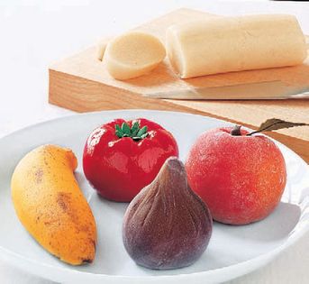 A paste of ground almonds and sugar, marzipan is sold in block form or made into varying miniature shapes of fruit, vegetables or animals. It is used in baking, as a tart filling, to stuff dates and sweetmeats, or can be rolled out into thin sheets to decorate and cover fruit cakes and cassata. Though marzipan is often said to have been named after the Latin marci panis (Mark’s bread), it is more likely to have come from the Middle East, where it was originally made from sugar, ground almonds and rosewater. It was regarded as a delicacy and sometimes covered with gold leaf.