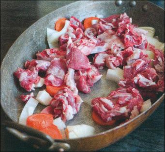Spread the meat from the trimmings in the roasting pan with sliced carrot and onion. Roast these for about 20 minutes in a 400°F oven.