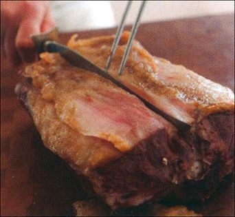 To carve the saddle lengthwise, cut along the top of the loin muscles with the knife parallel to the cutting surface.