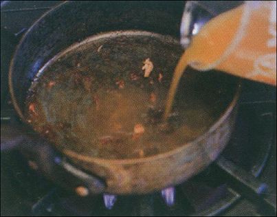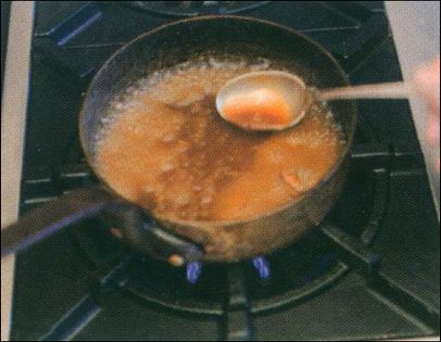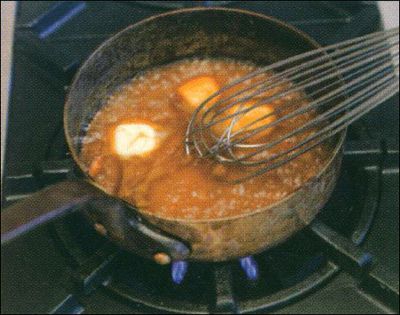 Take the noisettes out of the pan and pour out the burnt oil. Deglaze the pan with whatever you choose. Here, broth is used.