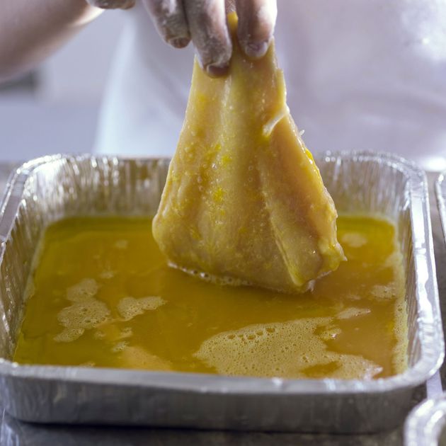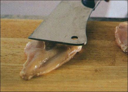 Dip the chicken in egg beaten with salt and pepper. Wipe off the excess egg.