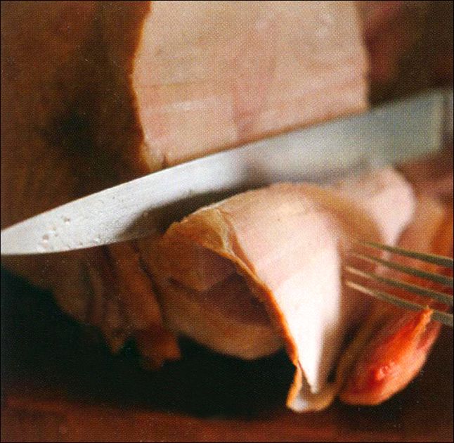 Hold the thigh with a fork and slide a carving knife along the inside of the thigh against the breast.