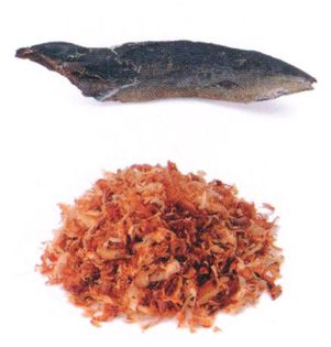 This type of fushi is made using a fish that is known in Japan as the sodagatsuo which, as its name suggests, is related to the katsuo and has the scientific name auxis; common name ‘bullet’ or ‘frigate’ tuna. Because several sub-species of this fish have high levels of chiai, they are not ideal for eating in their natural state and are therefore made into fushi. The main centre of fishing for this species is Kochi prefecture, on the island of Shikoku. During the production process, most fish are split into two, though smaller specimens are sometimes kept in one piece. Sodabushi results in a stronger tasting and smelling dashi than magurobushi, and is therefore more commonly used in simmered dishes and in stock for udon and soba noodle dishes. It appears as both arabushi and karebushi, which are favoured in Kansai and Kanto respectively.