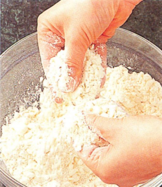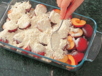 For a simple crumble topping, rub unsalted butter into plain flour until the mixture resembles fine breadcrumbs. Stir in the caster sugar.