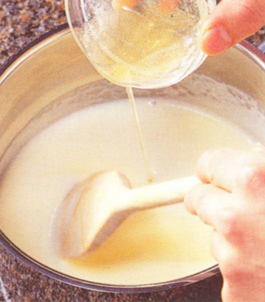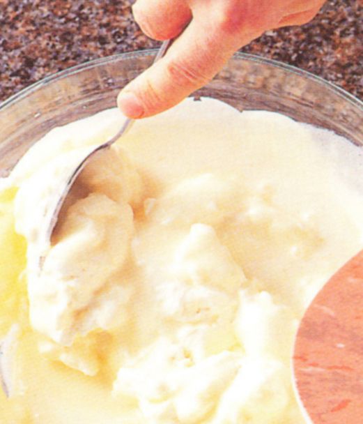Dissolve 15 g powdered gelatine in 3 tbsp water and stir this into 1 quantity warm Crème Anglaise. Pour into a bowl and allow to cool.