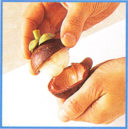 Scoop out the white segments of fruit with a small spoon. These segments contain stones which are inedible.