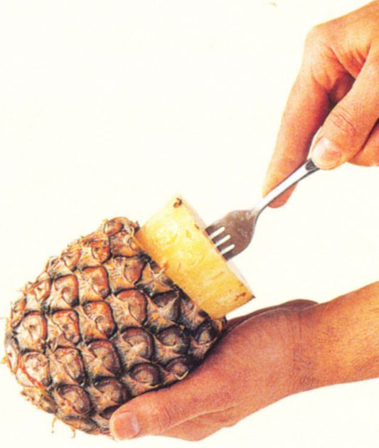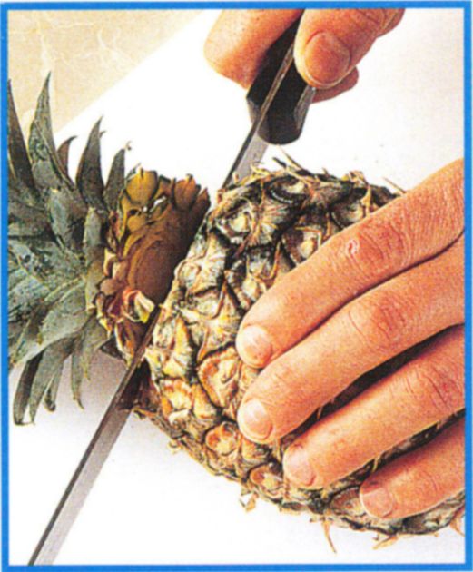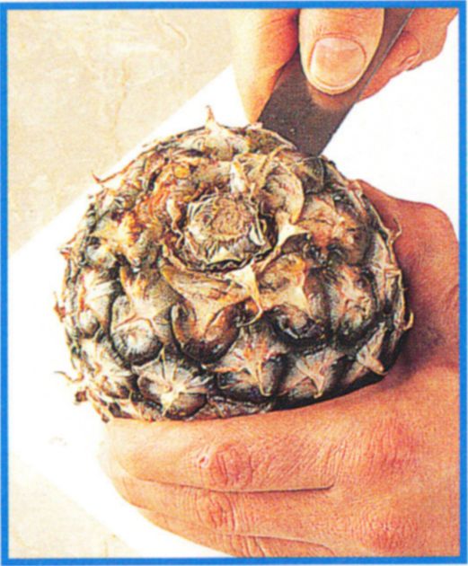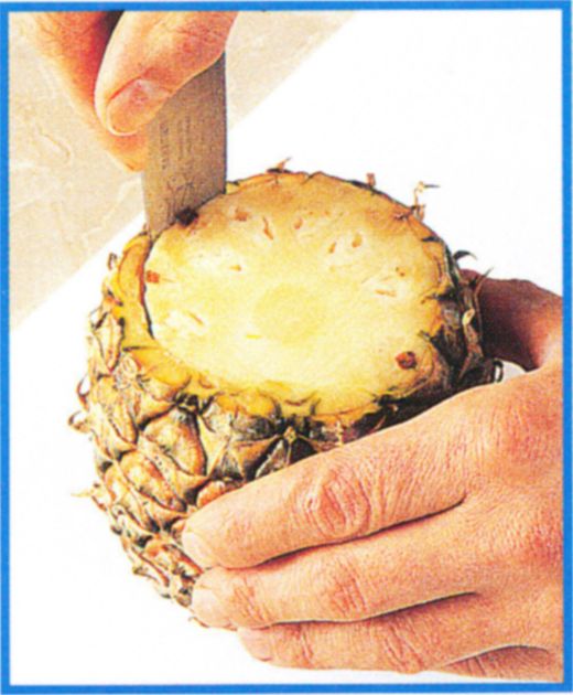 Bear in mind when selecting fruit that sweet and juicy pineapples tend to have a hint of deep gold colour in the skin. There are two methods of preparing a pineapple shell as a container. The first is to halve the fruit lengthways, cutting straight through the leaves and body of the fruit, then to scoop out the flesh. The method here shows how to leave the whole shell intact, ideal for miniature pineapples, which can then be offered as containers for individual portions.