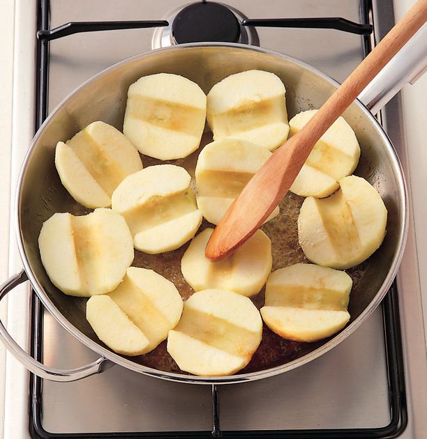 Melt 50 g unsalted butter in a shallow pan, then add 100 g sugar and 1 tbsp water. Add 1.2 kg peeled, cored and halved Golden Delicious apples and cook until golden underneath. Cool slightly.