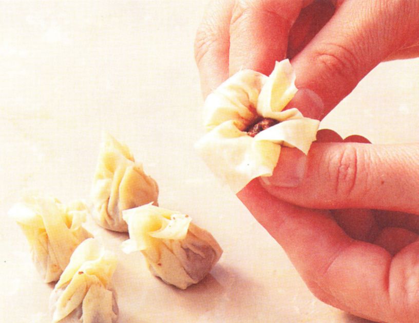 For 30 chocolate hazelnut bundles, use 1 quantity filo pastry. Cut out 9 cm squares of pastry. Place some filling in the middle of each bundle and wrap it up. Gather the edges of the pastry and pinch together to seal.