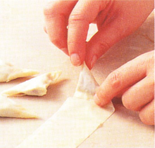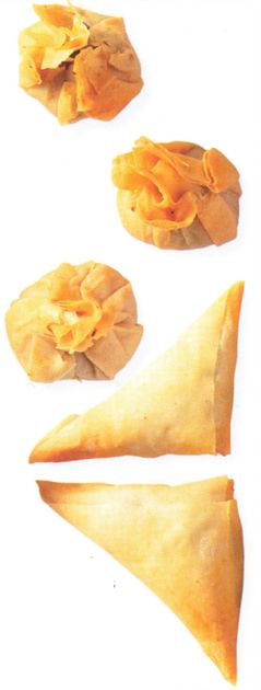 Cut 30 strips of filo that are 5 x 15 cm, for triangular pastries. Place some filling at one end and roll over an edge to form a triangle. Fold this triangle repeatedly over the filling along the entire length of the pastry strip.