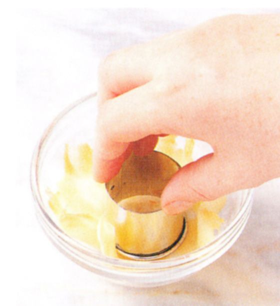 Loosen the baked tuile with a palette knife. Place it in a bowl and shape it by weighting the centre with a biscuit cutter.