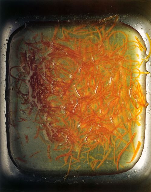 Blanch the zest in a small saucepan of boiling water and refresh under cold water, then drain. Cook in a dense sugar syrup (made with two parts sugar to one part water) until the zest has completely softened and become translucent.