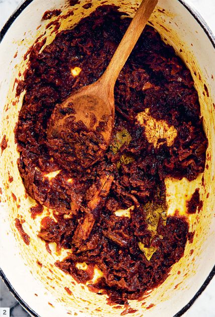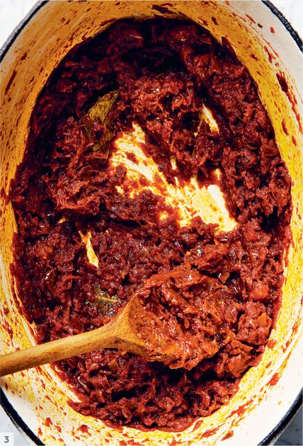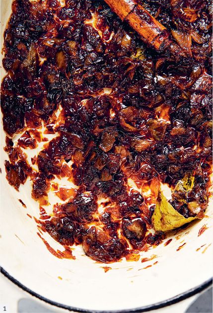 Cooking the powdered spices with the caramelised onions until cooked through.