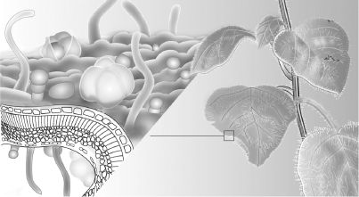 Mint family anatomy. A leaf of oregano, showing the microscopic oil glands that cover the surfaces of herbs in the mint family. The fragile, exposed glands filled with pungent essential oil offer a first line of defense against predators.