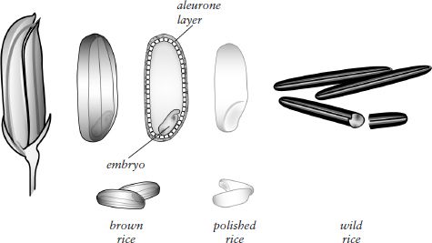 Different forms of rice. Brown rice includes the outer fruit and seed coats that make up the bran, and the embryo and oil- and enzyme-rich aleurone layer. Polished rice is the central mass of endosperm cells, freed from all other parts of the grain; it’s mainly starch and protein. Wild rice is the whole grain of a North American grass; it is heated to dry it out and develop flavor, and this processing gives its endosperm a distinctive glassy appearance.
