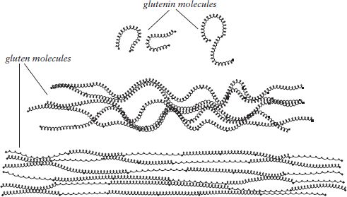 Gluten formation. When flour is mixed with water and made into a dough, glutenin protein molecules link up end-to-end to form long, composite gluten molecules. Dough is elastic because the gluten molecules are coiled and have many kinks in them. When a mass of dough is stretched, the kinks are straightened out, the coils extended, and the proteins get longer (bottom). When the stretching tension is released, many of the kinks and coils re-form, the protein mass shortens, and the dough shrinks back toward its original shape.