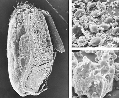 Wheat grain and flour. Left: The wheat kernel before milling. Its actual length is about a quarter of an inch/6 mm. Upper right: Soft wheat flour. The protein in this kind of wheat comes in thin, weak sections interrupted by starch granules and air pockets. When milled, it produces small, fine particles. Soft flour makes a weak gluten and is preferred for tender pastries and cakes. Lower right: Hard wheat flour. The protein matrix in hard wheat endosperm is strong enough to break off in chunks during milling. Hard flours make strong gluten and are preferred for most bread making.