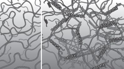 How gelatin turns a liquid into a solid. When the gelatin solution is hot (left), the water and protein molecules are in constant, forceful movement. As the solution cools and the molecules move more gently, the proteins naturally begin to form little regions of collagen-like helical association (right). These “junctions” gradually form a continuous meshwork of gelatin molecules that traps the liquid in its interstices, preventing any noticeable flow. The solution has become a solid gel.