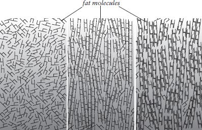 The crystallization of cocoa butter. Left: In melted chocolate, the fat molecules of cocoa butter are in constant random motion. Center: When chocolate cools in an uncontrolled way, the fat molecules form loosely packed, unstable crystals, and the chocolate is soft and greasy. Right: When chocolate is carefully cooled, its fat molecules form tightly packed, stable crystals, and the chocolate is snappy and dry.