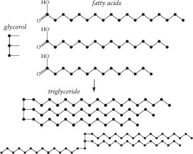 Fats and fatty acids. Fatty acids are mainly chains of carbon atoms, shown here as black dots. (Each carbon atom has two hydrogen atoms projecting from it; the hydrogen atoms are not shown.) A fat molecule is a triglyceride, which is formed from one molecule of glycerol and three fatty acids. The acidic heads of the fatty acids are capped and neutralized by the glycerol, so the triglyceride as a whole no longer has a polar, water-compatible end. The fatty-acid chains can rotate around the glycerol head to form chair-like arrangements (bottom).