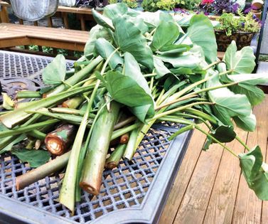 Karkalo (common names: Colocasia, Taro Leaf, Dasheen, Arbi Patta; botanical name: Colocasia antiquorum) is the Nepali name for the taro plant, which comes from a tuberous root. It is a tall-growing plant that has clusters of attractive, heart-shaped leaves resembling the beautiful ornamental variety of the elephant ear plant. The leaves are usually broad, bright green, and velvety to touch. In Nepal, we use all three parts of the plant including the leaves (karkalo ko paat), the young stalks (gaabaa or gaavaa), and the taro tubers or corms (pidhaalu).