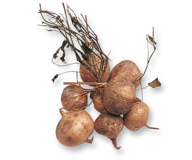 Jicama (bangkuang) is crunchy and juicy white tuber that is peeled and eaten raw, sliced and served with rock salt or dressing as a refreshing snack. Look for it in the produce section of supermarkets.